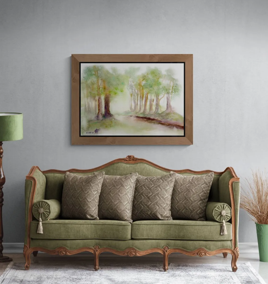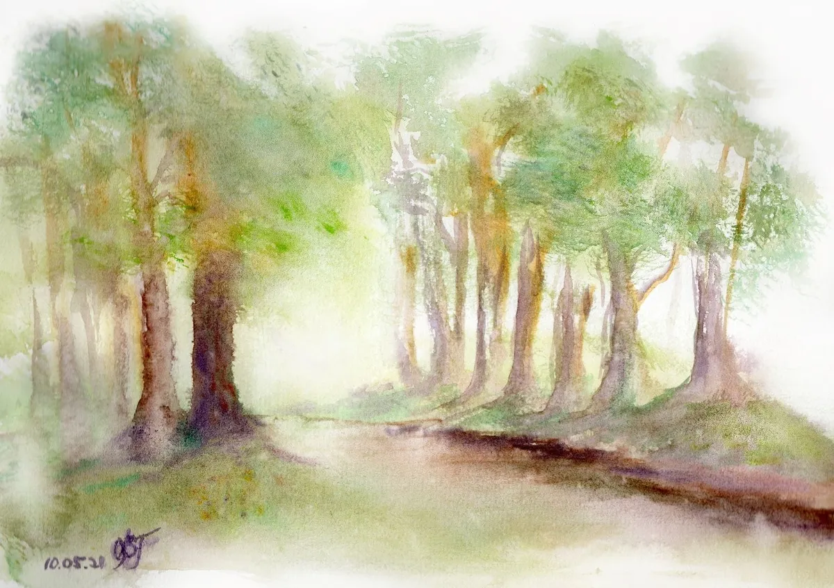 A dreamy landscape watercolor painting of a pine trees alley, Jeløy Moss Norway. Spring 2021. Original Watercolor on 200 g. paper. Available as Giclee print made to order in custom sizes. Contact me.