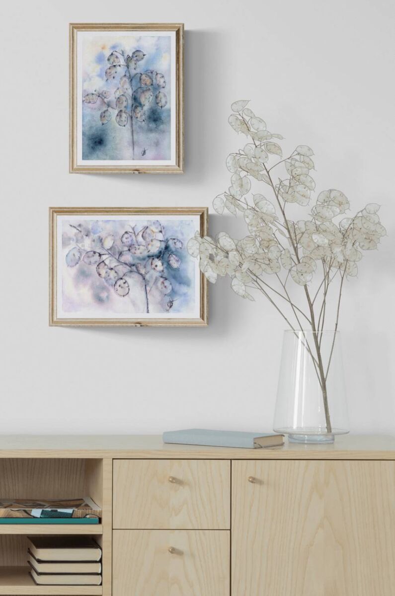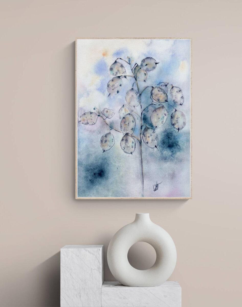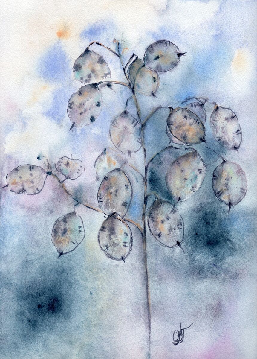 Captured Lunaria Annua plant which is enjoying daylight. Focus on warm feelings about the present moment. Calming vibes are in a soft balance with organic shapes, tender and natural earth colors. Watercolor artwork painted on Arches paper, 100% cotton, 300g, CP GF