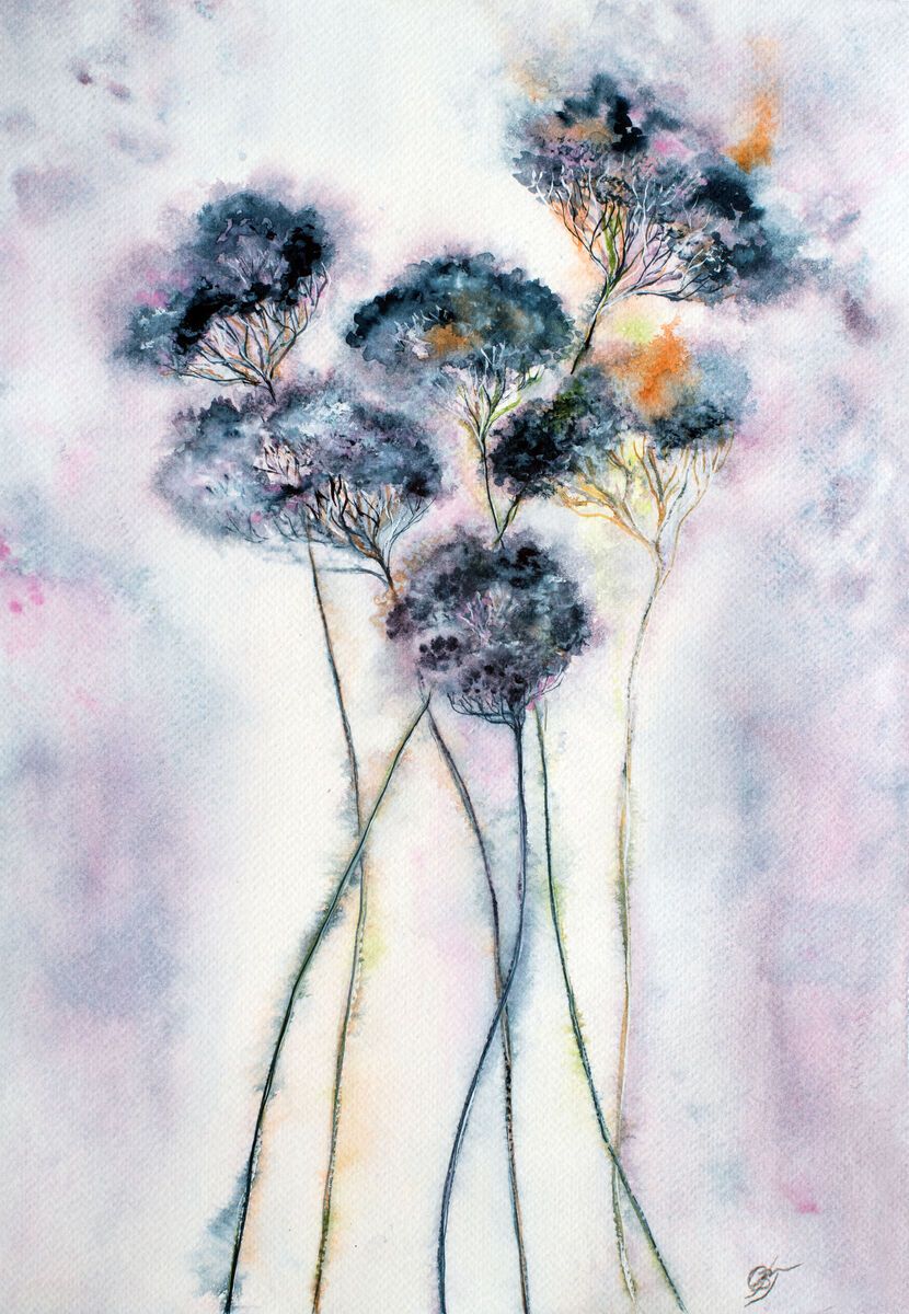 This artwork inspired by lovely Achillea millefolium plants I have collected in autumn 2021. Captured one of the impressions I got from natural composition growing beautifully along the coast line of the Oslo fjord, Norway. A semiabstract vision. The plants are showing their family. Painted on Fabriano 25% cotton paper CP, GF. 300g.