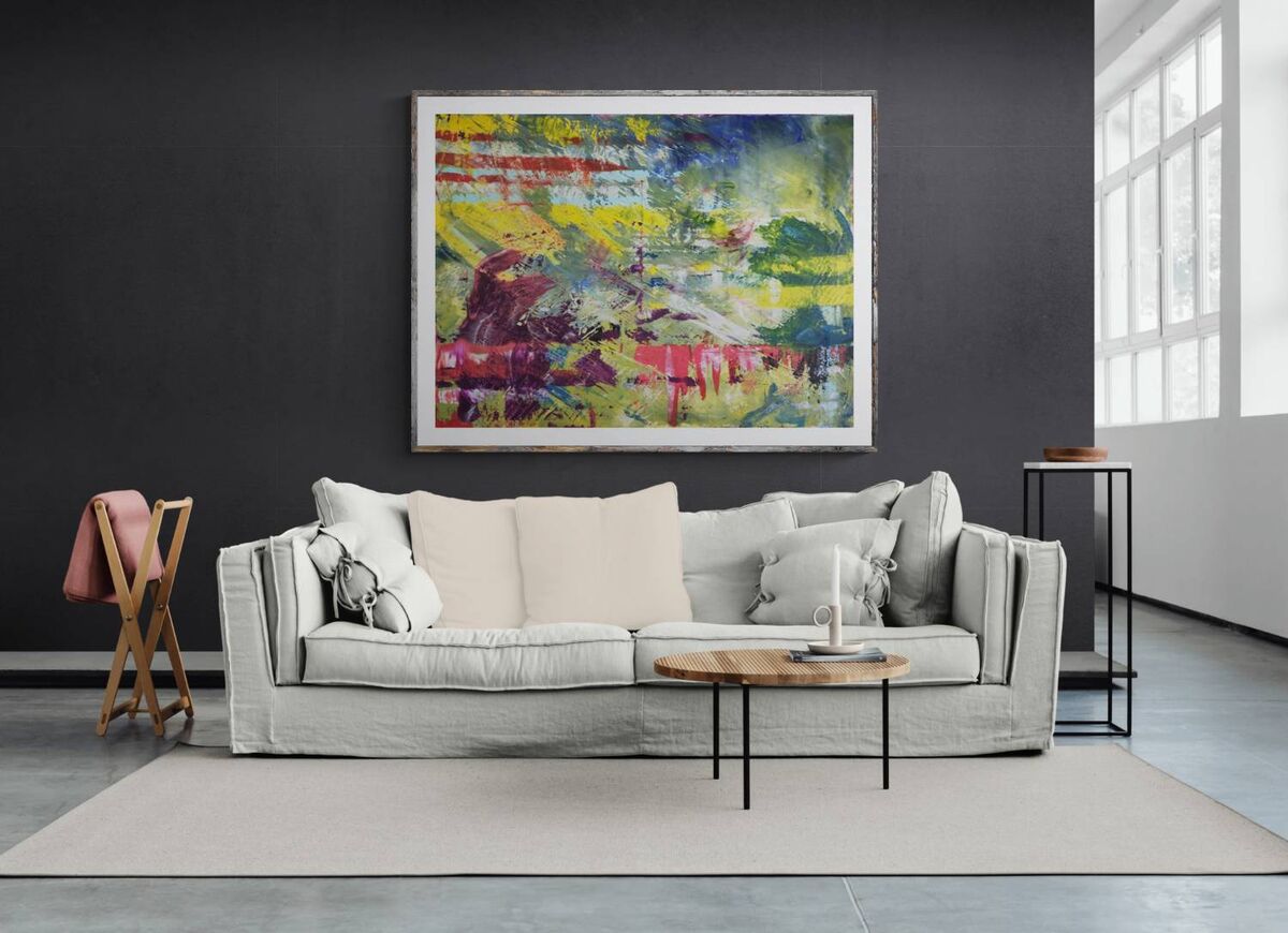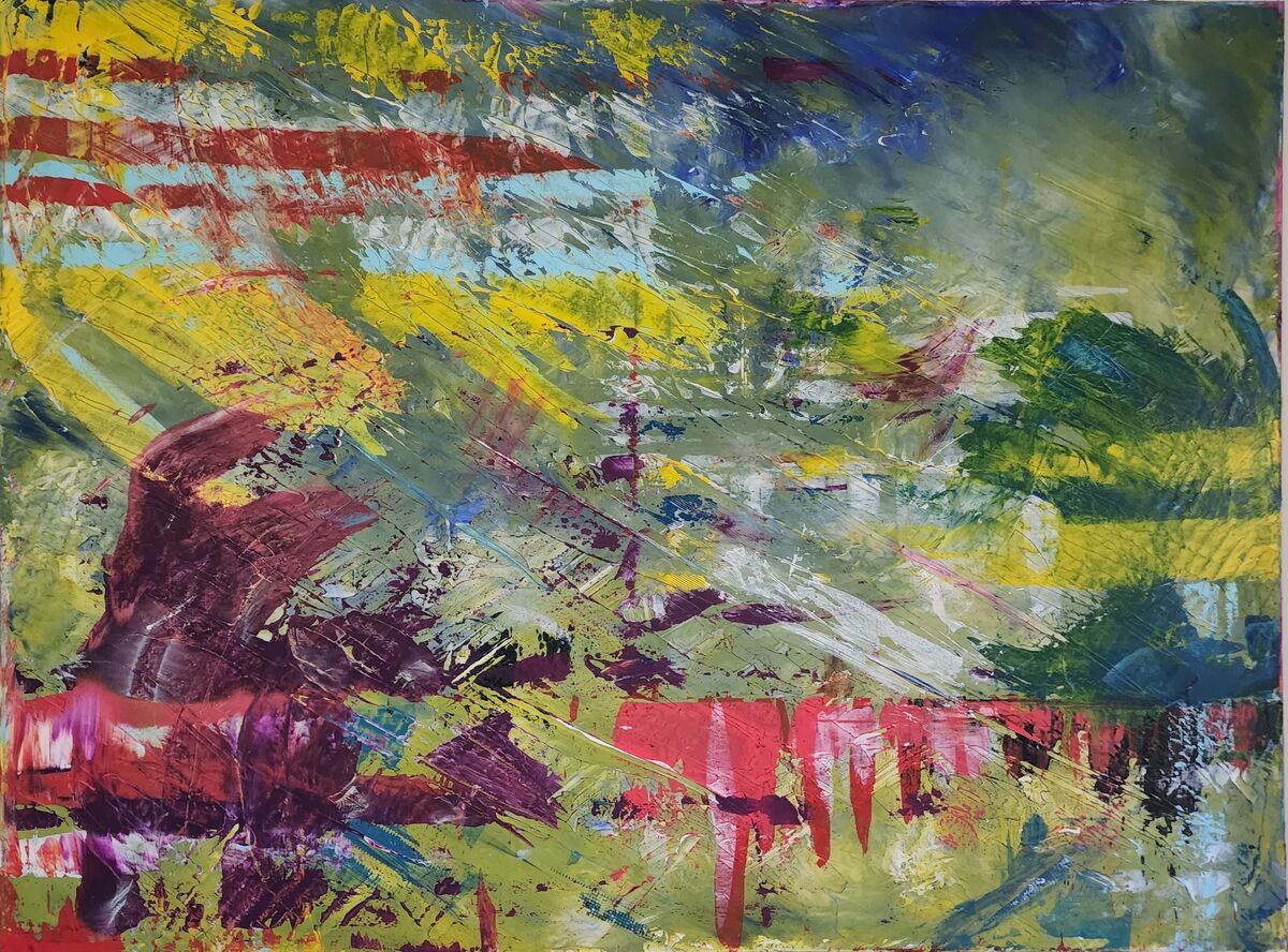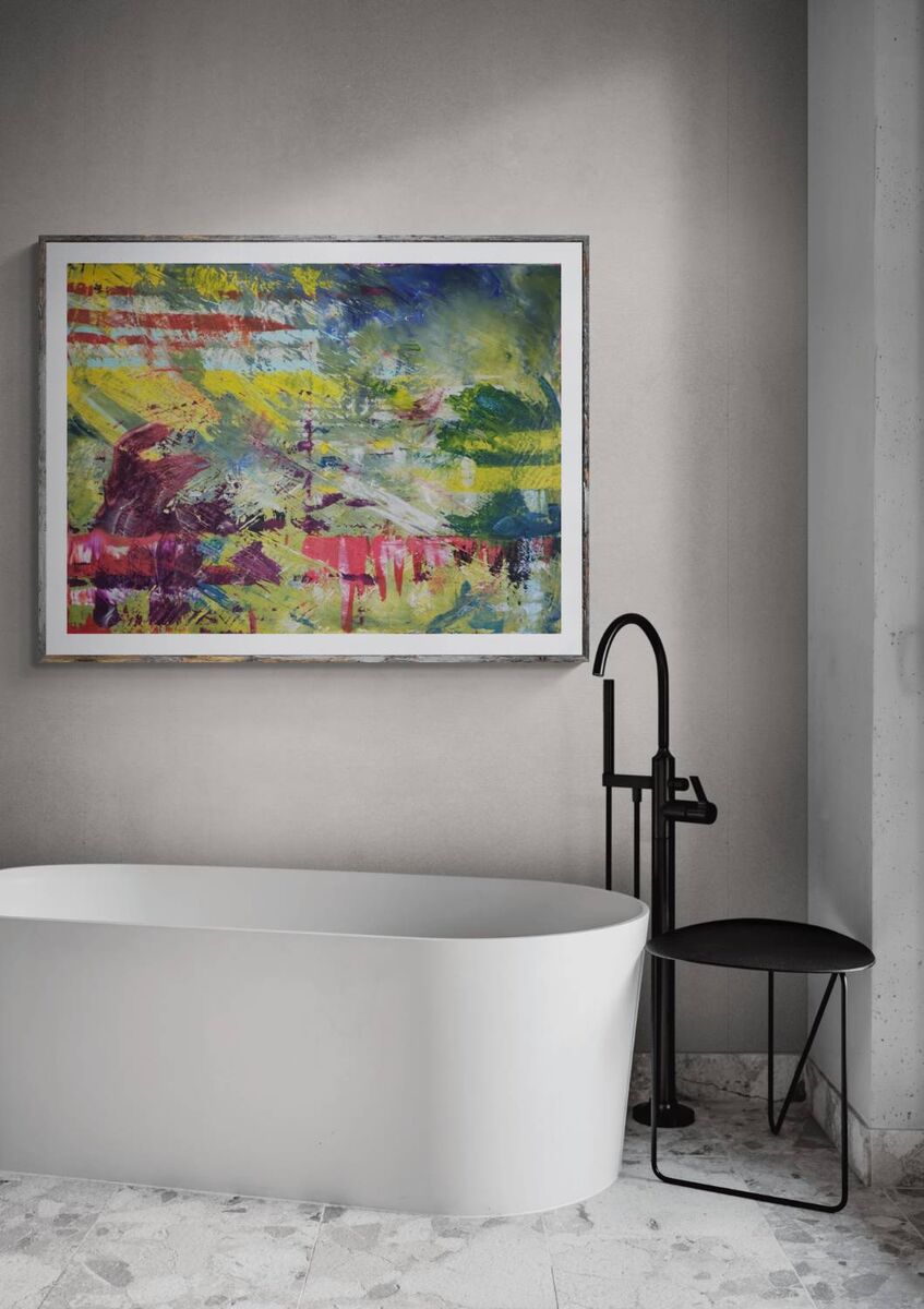 "DUMBO 4," a piece from your DUMBO series, depicts a section of an urban building in the Brooklyn neighborhood. The watercolor showcases a realistic urban scene with a building featuring brickwork, two large metal roll-up doors, and arched windows that reflect the Manhattan Bridge. A vibrant vertical rectangle wall, transitioning from yellow at the bottom to red at the top, is centrally located, highlighting the play of light. Sunlight plays across the roll-up doors and onto the ground, casting dramatic highlights and enhancing the painting’s geometric composition. By blending old-world textures with contemporary elements, “DUMBO 4” pays homage to the distinctive character and vibrant atmosphere that make this Brooklyn hotspot so captivating.