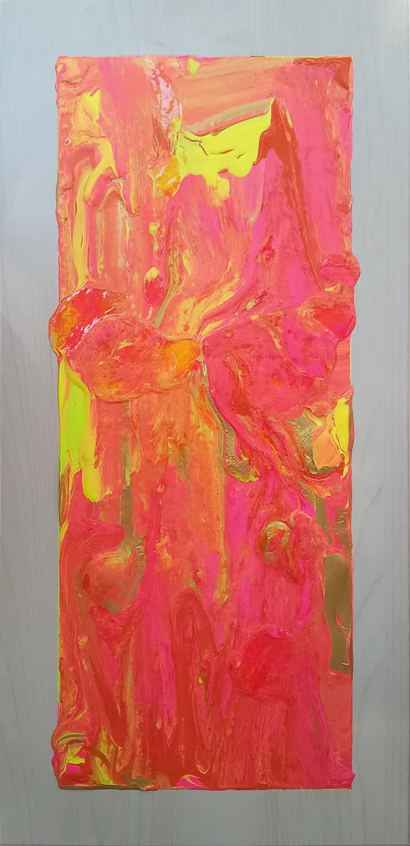 Only available as complete triptychon, € 1000 Euro each = € 3000. Studio gouache, acrylic moulding paste and acrylic paint in gold, fluorescent yellow, pink and orange on 3 upcycled industrial heavy-weight wood board.