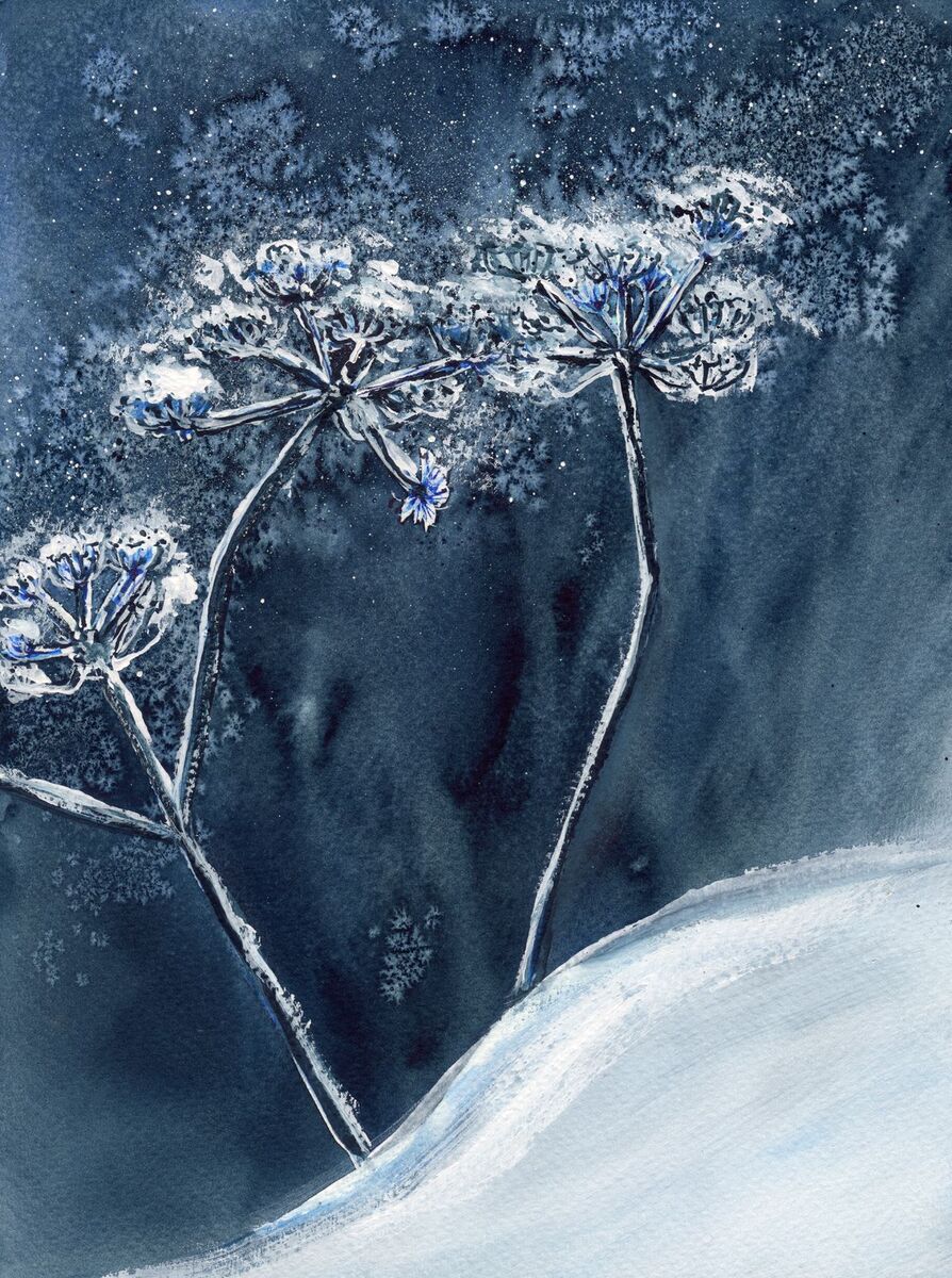 Inspired by Anthriscus sylvestris plant. Captured a motif of simple winter flowers. Indigo is the only color, intense and elegant which enriches the mood of the painting. The composition is filled with the beauty of a dreamy starry night. Illustration. Mixed watercolor technic. Painted on Fabriano 25% cotton paper, 300g, CP, GF.