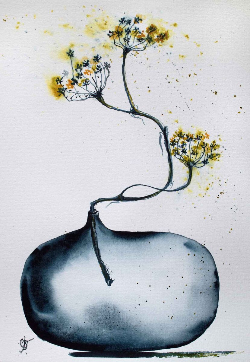 This is an artwork from series "Rare" inspired by modern handcrafted décor vases and wild growing flowers from Nordic nature. Both are beautifully rare and unperfect, they speak to each other. Figurative. Semiabstract. Still life. Painted on 100 % cotton paper, GF,CP,300g.