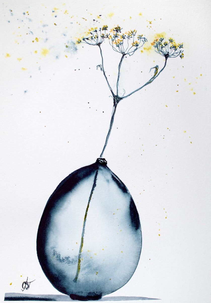 This is an artwork from series "Rare" inspired by modern handcrafted décor vases and wild growing flowers from Nordic nature. Both are beautifully rare and unperfect, they speak to each other. Figurative. Semiabstract. Still life. Painted on 100 % cotton paper, GF,CP,300g.