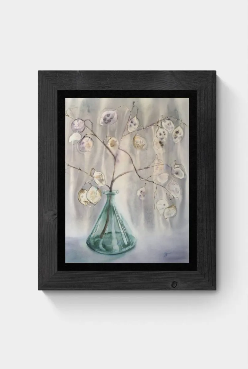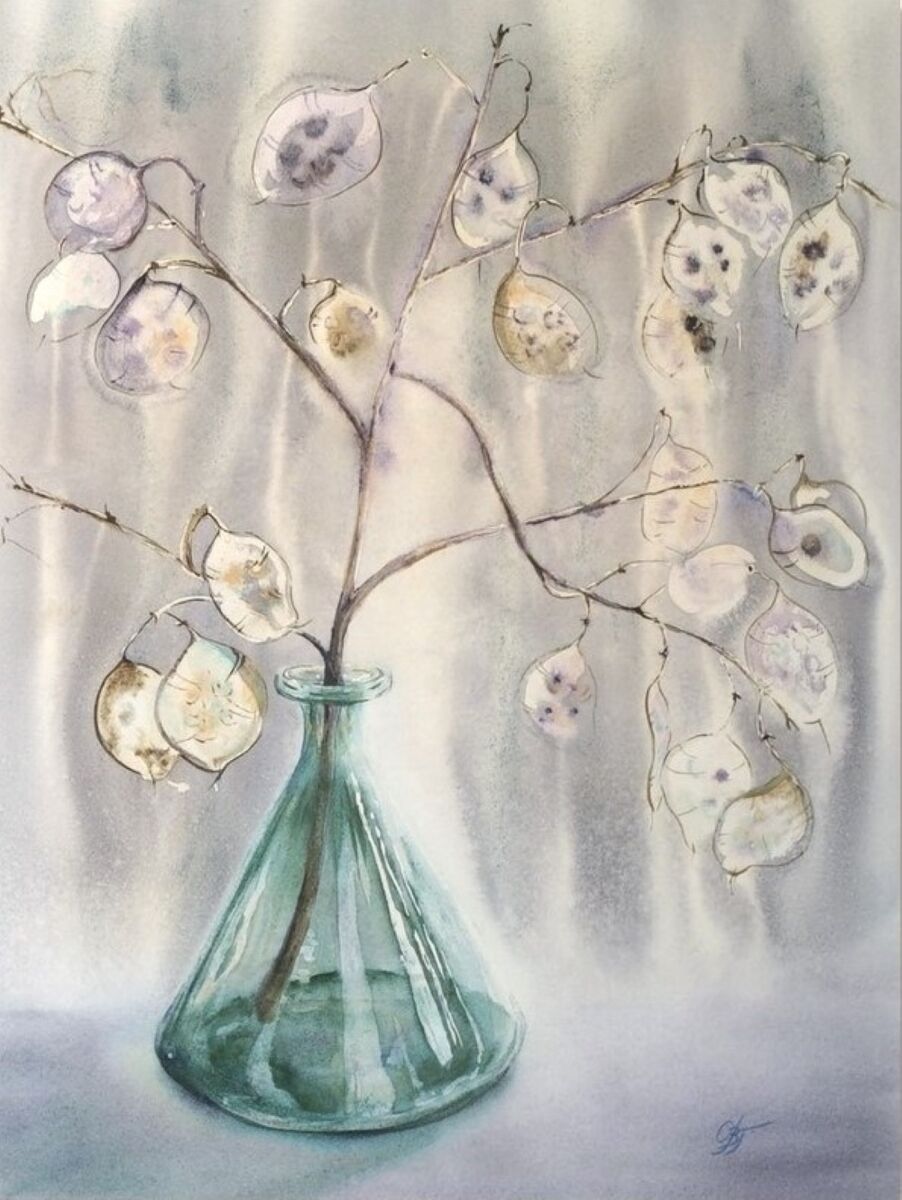 Captured a simple moment of today with a focus on a lovely still life composition. A green glass vase with dried Lunaria plants creates together a relaxing space. Calming earthy colors meet delicate light between the silver of the plant. The picture is about a dream to slow down time and extend the pleasure to be here. Figurative fine art. Artwork is painted on artist Hahnemuhle paper VP, 100%cotton, GF, 300g.