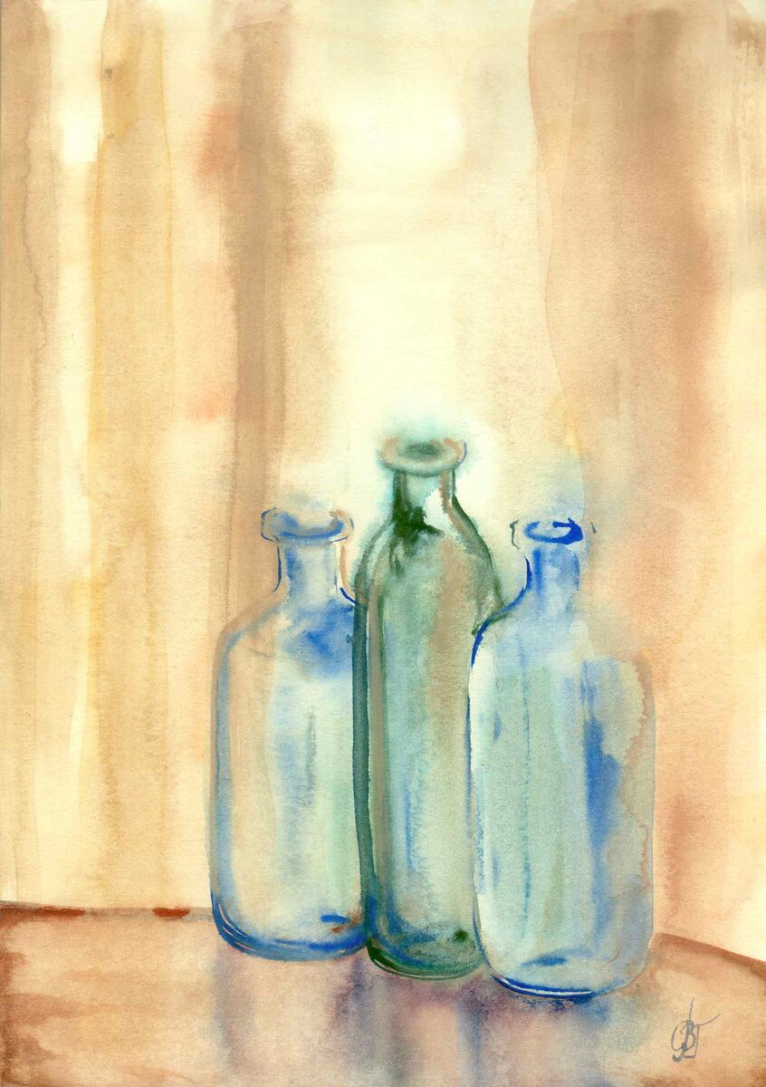 It is a painting of the three lovely bottles in my window. Still life. Impression. Semiabstract. Painted on Fabriano paper, 200g.