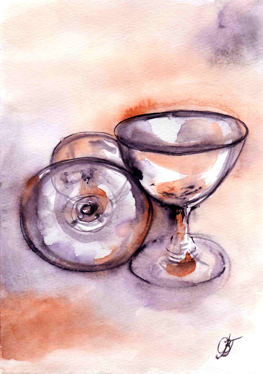 Live sketch art. Watercolor. Composition of two glasses. A fast sketch on watercolor paper with two colors. Semiabstract.