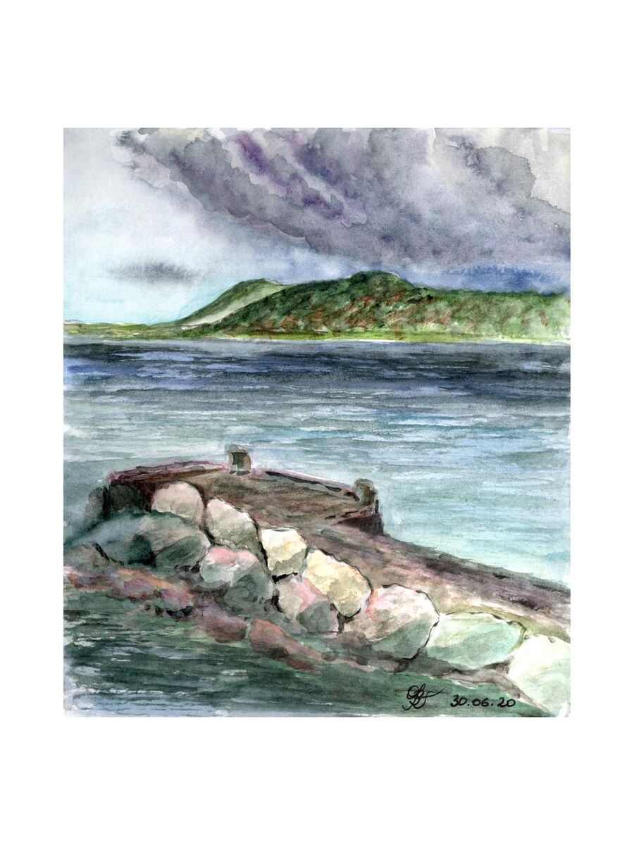 A see landscape painted from a cape island. Captured the view on Oslo fjord. A beautiful autumn sky at sunset. Live sketch art. Watercolor painting on 300g. paper.