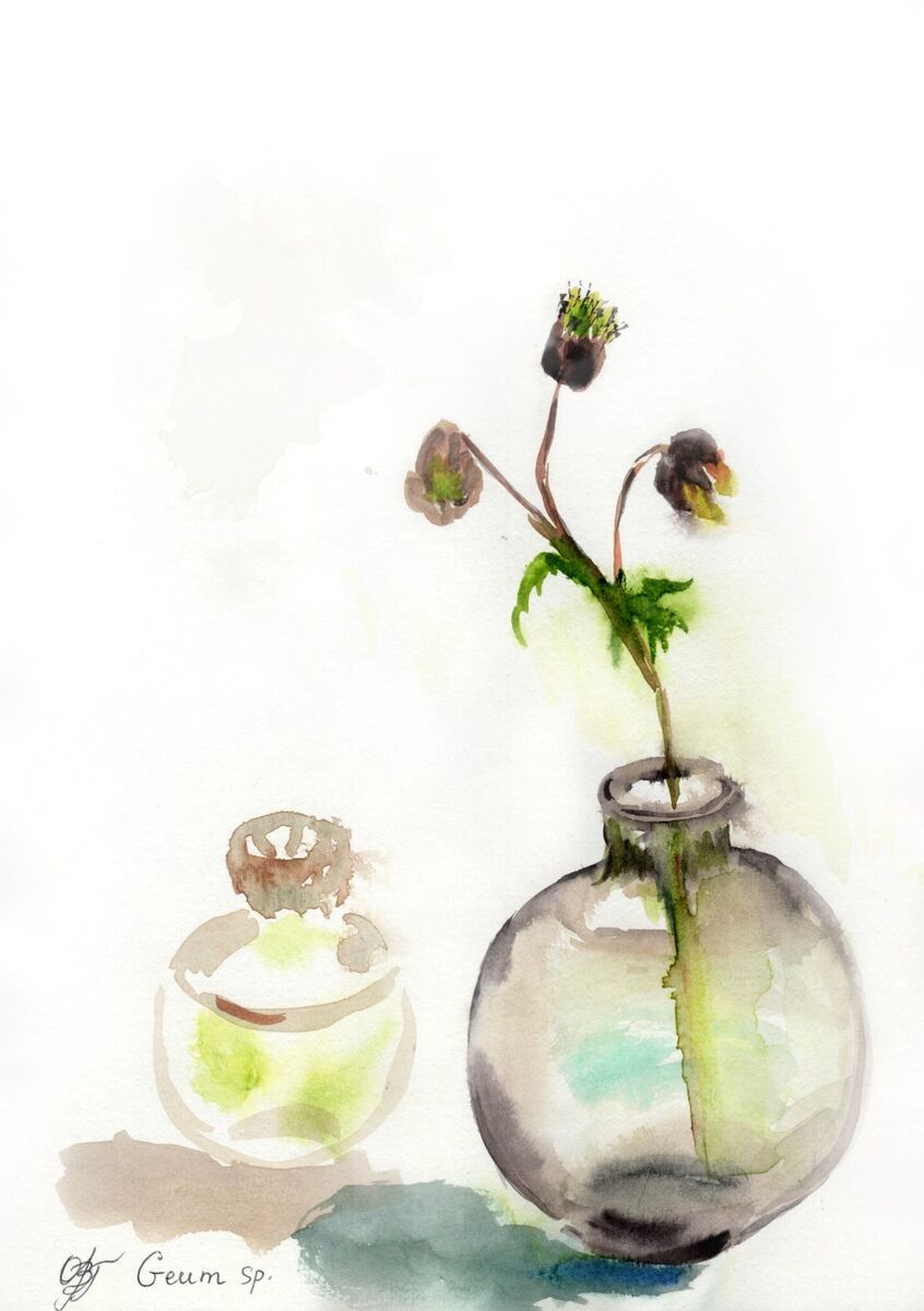 Live sketch art, still life, semiabstract imperfection. Geum sp. plant in glass vase. Play of evenings light in a transparent glass. Painted on watercolor paper, 230g.