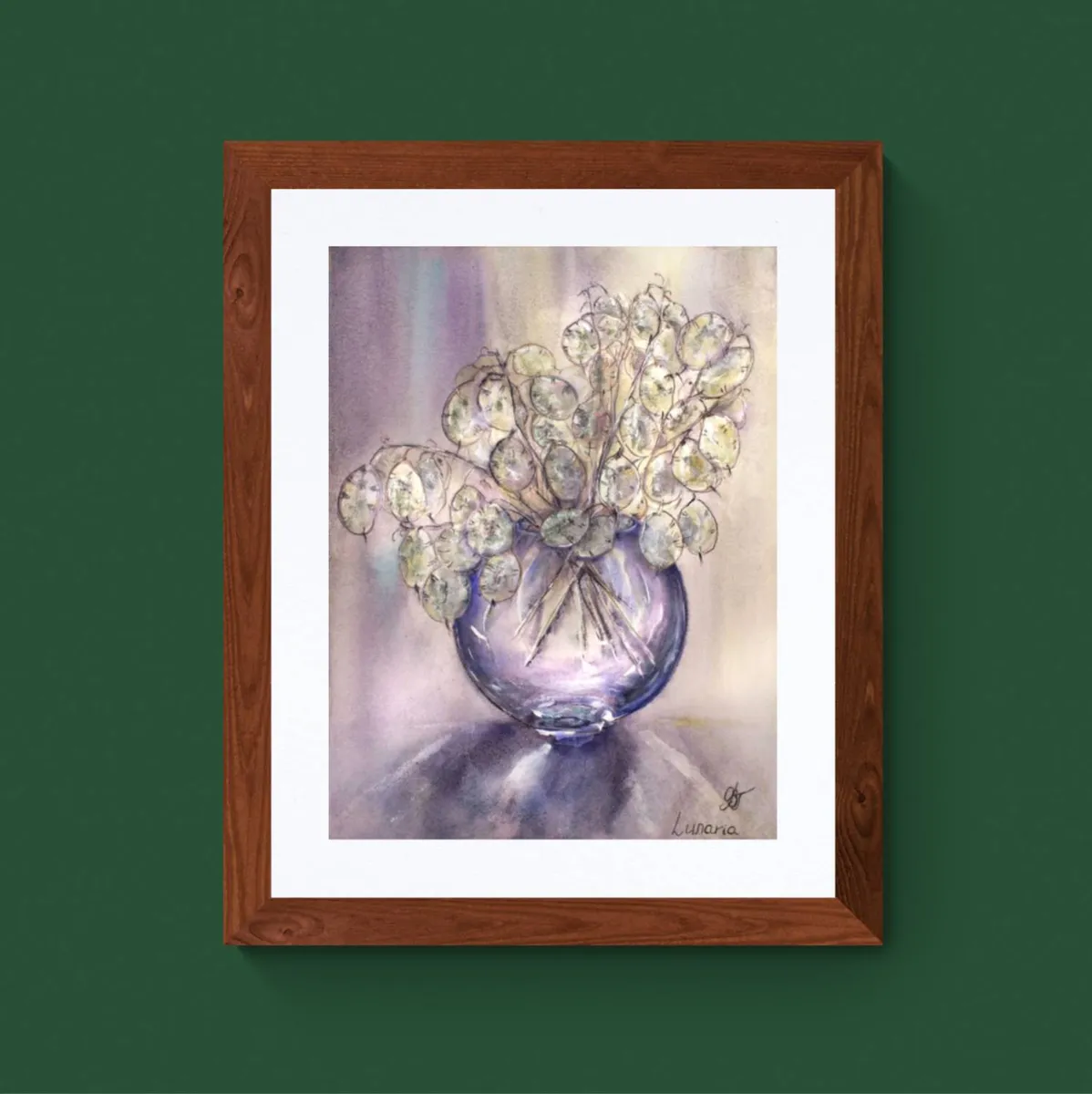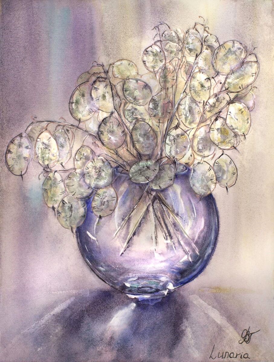 Figurative. Still life. Artwork is inspired by a bouquet of the naturally dried Lunaria Annua plants from my garden. They are incredibly beautiful when daylight shines through the seed cups. Captured light and dreamy atmosphere around them. I will invite the viewers to be here, see and feel the stillness of this serenity moment. The nature shows its hidden side and fascinating by wonderful shapes and colors. Simply amazing to a contemplation. Painted on CP 100% cotton Fabriano artistico paper, GF, 300g.