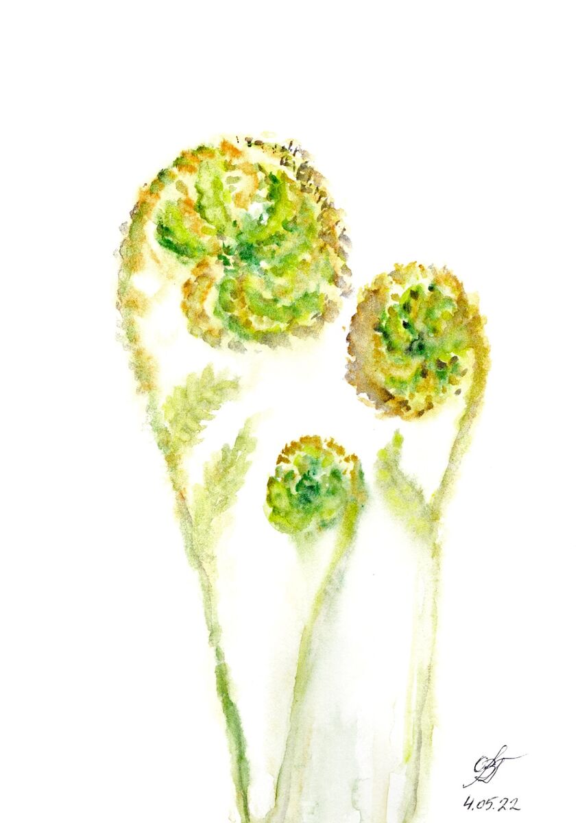 Live sketch art, semiabstract ferns at early summer. Watercolor botanical etude. Painted from nature on paper.