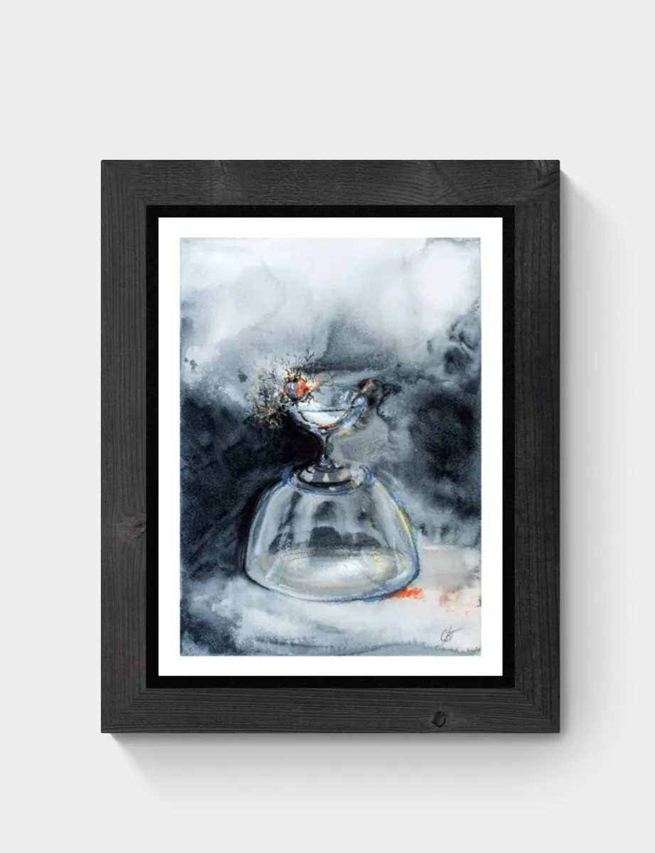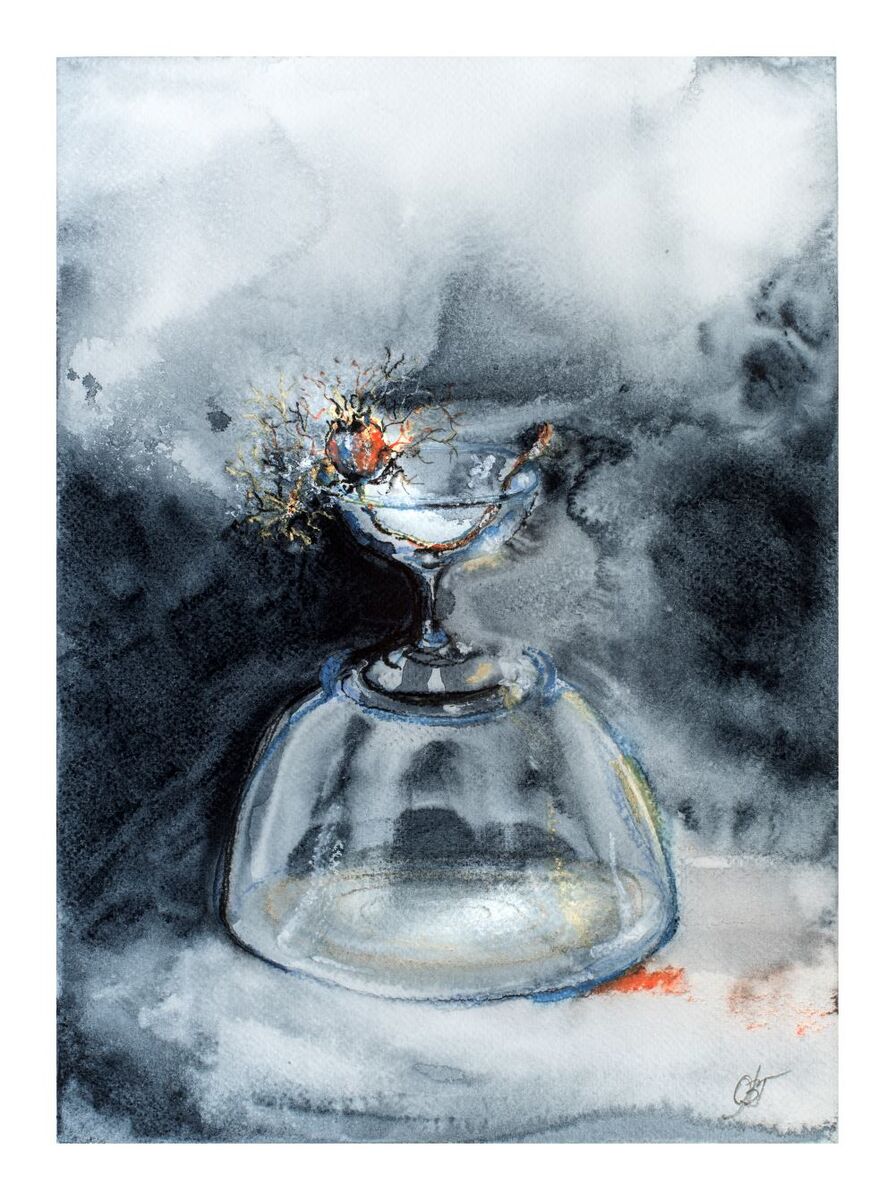 Watercolor artwork. Still life. Impression. Figurative. Semiabstract. Nigella sativa dried plant is arranged with a glass composition. The story about enjoying of every single moment of life. Painted from the nature on Fabriano 25%cotton, CP,300g paper.