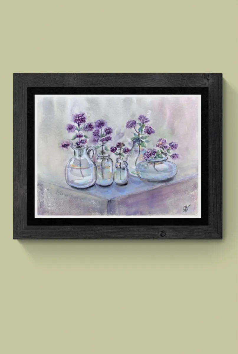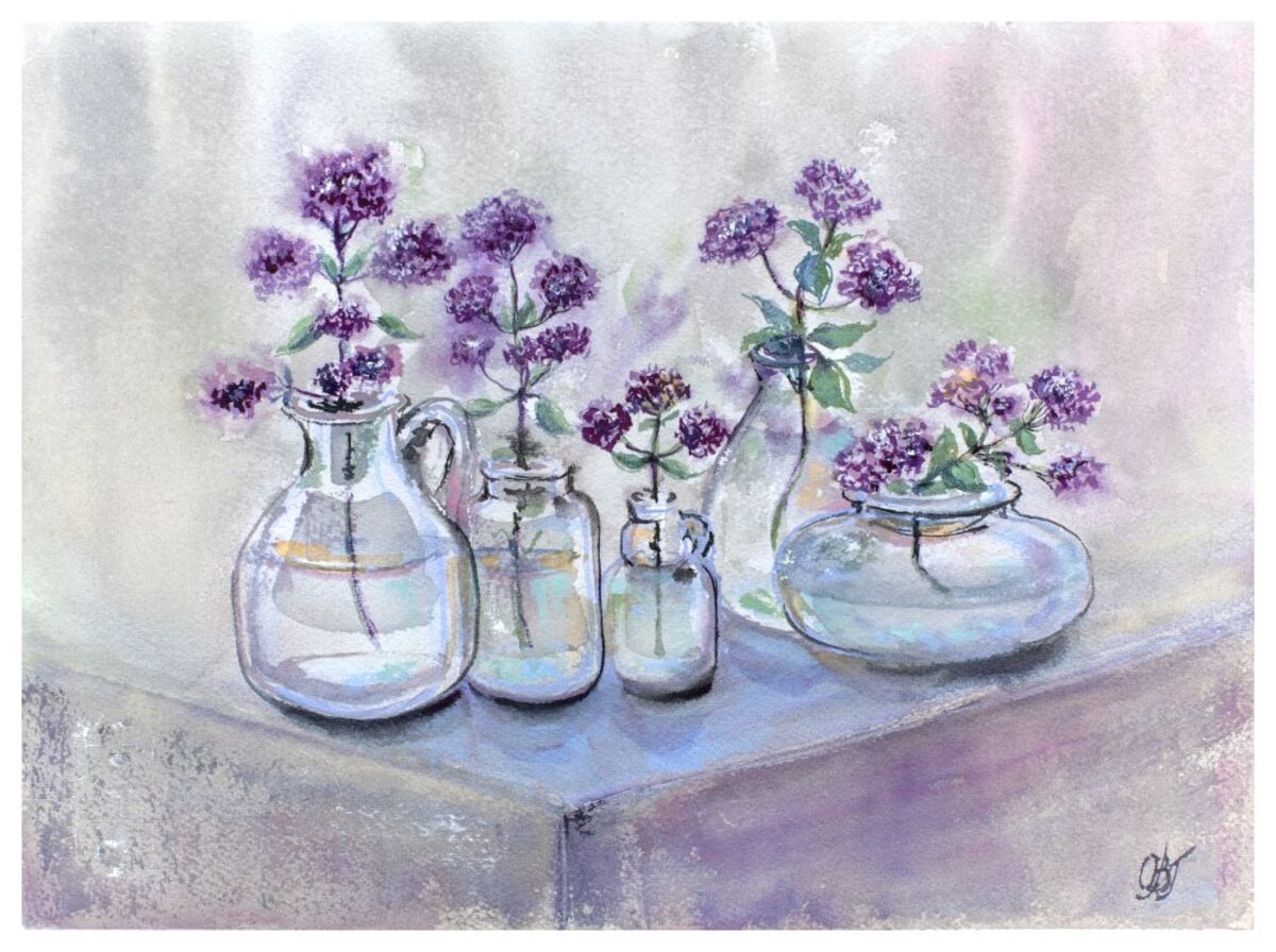 Watercolor artwork inspired by Origanum flowers in an arrangement with botanical glass vases. Impression. Still life. Figurative. Semiabstract. Painted on Arches 100% cotton, CP, 300g paper.
