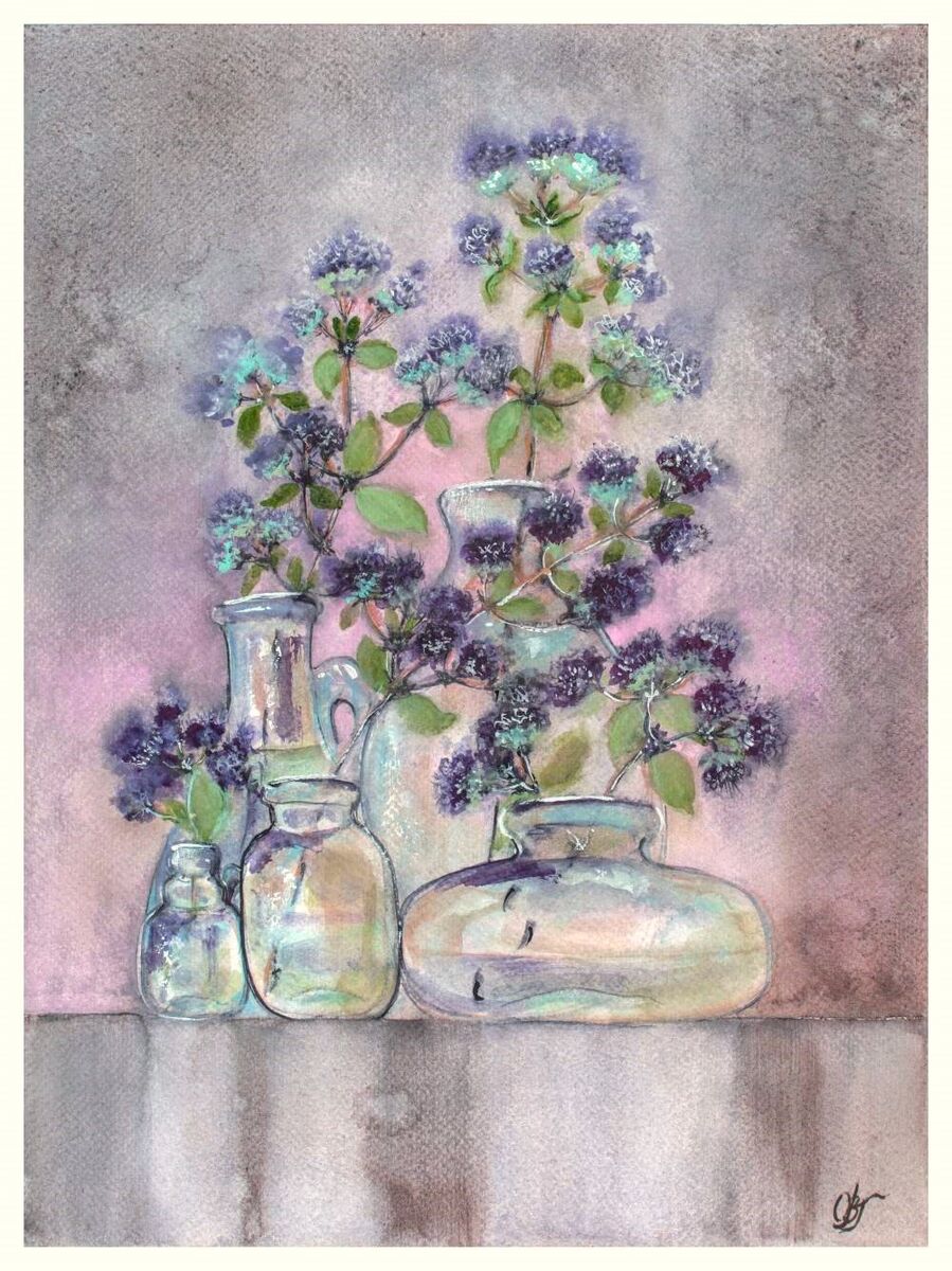 "Kveld" means Evening, is the watercolor painting of an arrangement of Origanum flowers with a collection of botanical vases. Muted tones. Impression. Figurative. Semiabstract.
