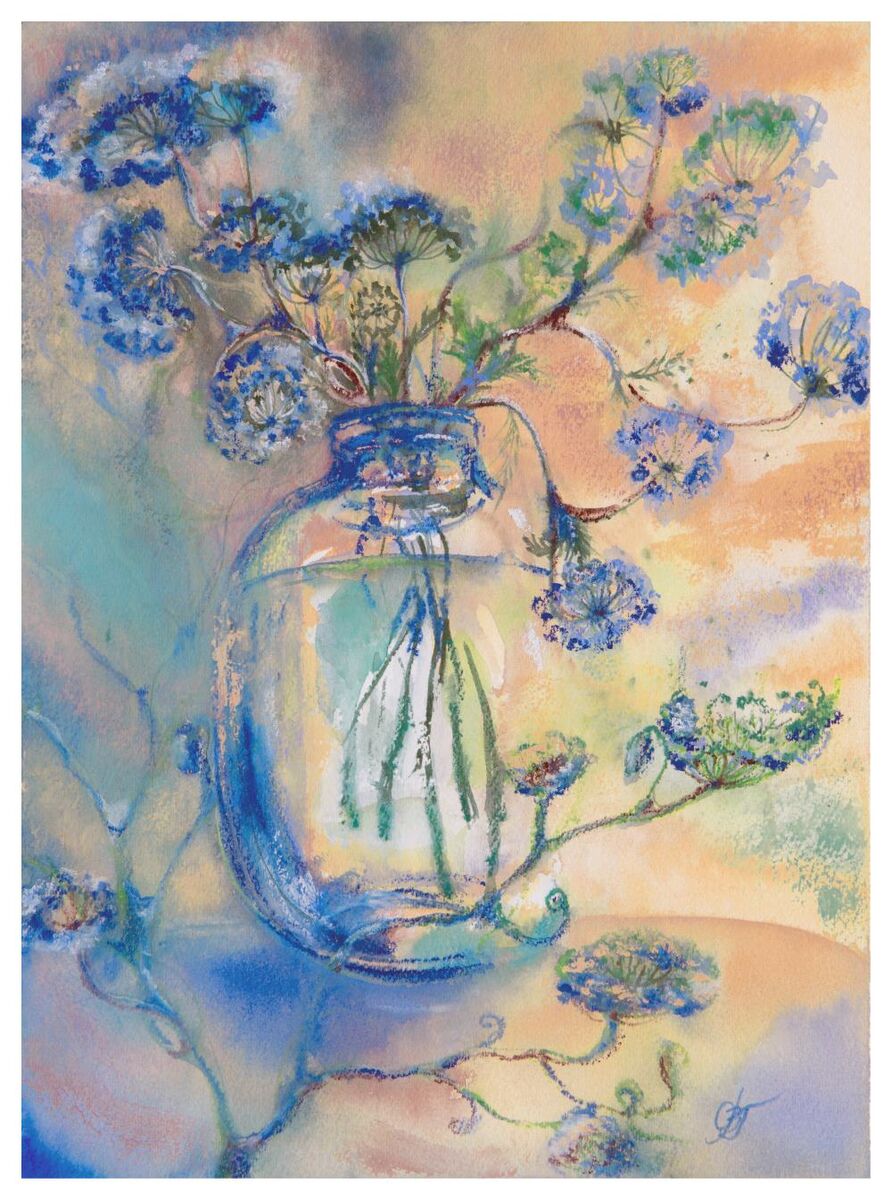 Watercolor artwork. Still life. Impression. Figurative. Semiabstract. Inspired by Daucus carota fresh and dried flowers. Arranged with glass vases. Painted on Fabriano 100% cotton, Cp, 300g.