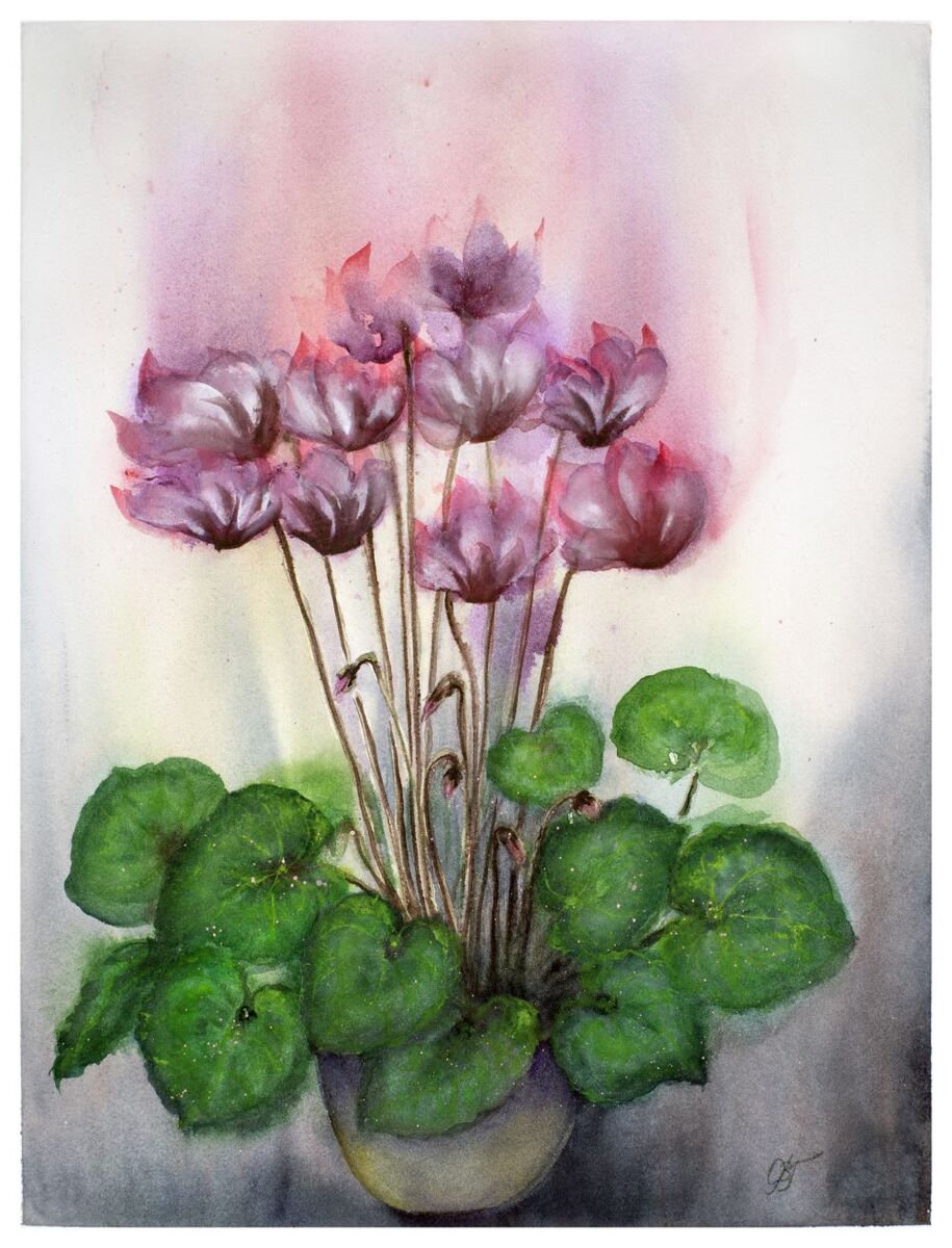 Watercolor calm still life. Flowering cyclamen in a pot. Impression. Painted on Fabriano artistico 300g cotton, CP,GF.