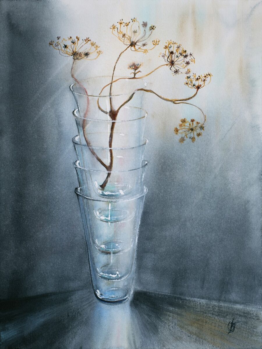 Watercolor. Single artwork. Still life. Figurative. The composition of 5 transparent glasses and dried flower / Pimpinella Saxifraga/. The story about how I feel my intuition – the 6th Sense. The feelings I am reflecting here - wonder, mystery, calmness, love, joy, gratitude. The silent dialogue with nature that leads to the way I go. Presence of harmony in the space, airiness. Painted from nature on HP 100% cotton paper, satin, 300g. Mixed technique /wet-on-wet; dry-on-dry, layers/. Earthy colors. Original artwork is available for sale. Please contact me for purchase: ovg.sen.art@gmail.com or via "inquire"