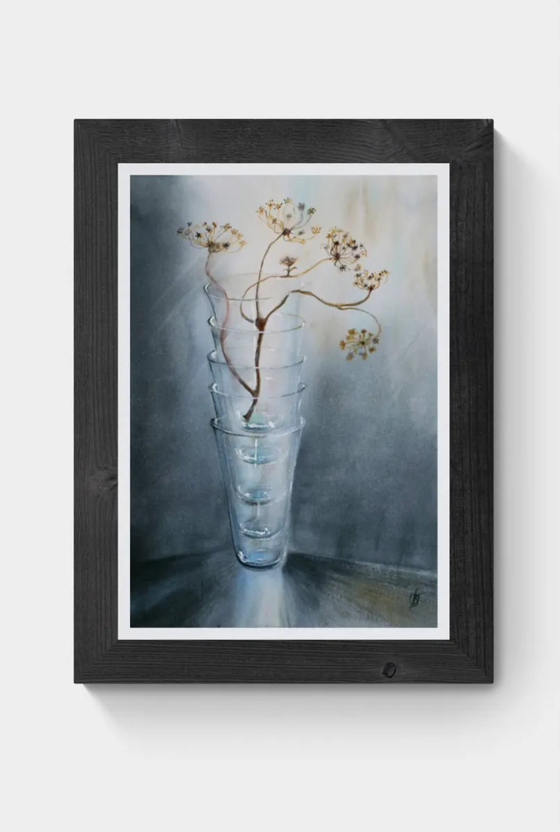 Still life, 5 glasses and dried flowers